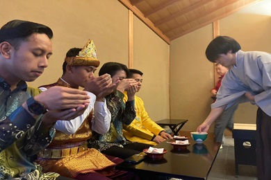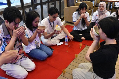 茶道を体験する参加青年(北九州市)