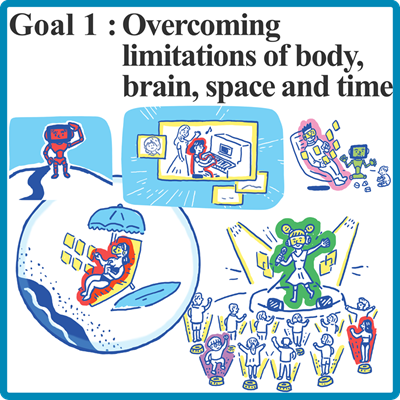 Realization of a society in which human beings can be free from limitations of body, brain, space, and time by 2050.