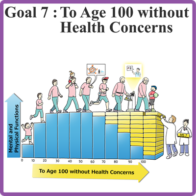 Realization of sustainable care systems to overcome major diseases by 2040, for enjoying one’s life with relief and release from health concerns until 100 years old.