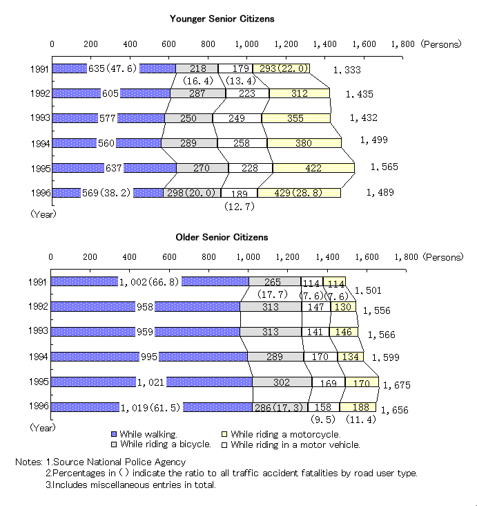 Traffic Accident Fatalities Classified into Younger and Older Senior Citizen Groups and Broken Down by Road User Type