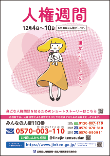 法務省では2024年度、12月4日から10日までの1週間を「第76回人権週間」と定め、関係諸機関及び諸団体の協力の下に、世界人権宣言の趣旨及びその重要性を広く国民に訴えかけるとともに、障害のある人に対する偏見や差別の解消を含め、人権尊重思想の普及高揚を図るため、法務局・地方法務局及び人権擁護委員等により、全国各地で人権啓発活動を実施した。「第76回人権週間」においては、「『誰か』のこと じゃない。」をテーマに掲げて周知ポスターの配布やインターネット広告による広報活動を展開するとともに、障害のある人の人権問題を含め、様々な人権問題をテーマにした人権啓発動画の配信や講演会の開催等の各種広報・啓発活動を行った。