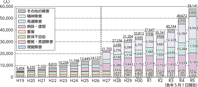 また、大学・短期大学・高等専門学校(以下本章では「大学等」という。)における障害のある学生の在籍者数が増加したことや、「改正障害者差別解消法」により、私立を含む全ての大学等での、障害のある学生への合理的配慮の提供の義務化されたこと等を踏まえ、「障害のある学生の修学支援に関する検討会報告(第三次まとめ)」をとりまとめ、各大学等へ周知している。併せて、先進的な取組や知見を持つ大学等が中心となり、大学等や関係機関等が参加・連携するプラットフォームを形成し、大学等や学生等からの相談対応や専門的知識を有する障害学生支援の人材育成等を通じて、高等教育機関全体における障害学生支援体制の推進を図る「障害のある学生の修学・就職支援促進事業」を実施した。