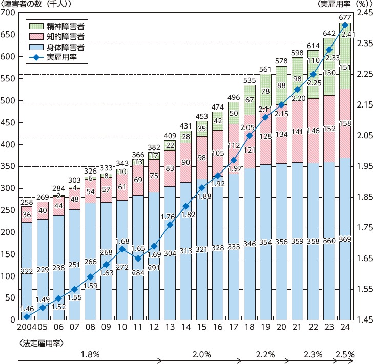 「障害者雇用促進法」では、民間企業等に対し、法定雇用率(障害者雇用率)以上の障害のある人の雇用を義務付けている。法定雇用率は、企業の社会連帯の理念に基づき、身体障害者、知的障害者又は精神障害者に一般労働者と同じ水準の雇用の場を、各事業者の平等な負担の下に確保することを目的として設定している。1960年の制度創設時においては、身体障害者のみが対象となっており、民間企業の障害者雇用は努力義務であった。その後、1976年に身体障害者の雇用を義務化し、1998年には知的障害者、2018年には精神障害者の雇用を義務化し、法定雇用率の算定基礎の対象に追加することとされた。また、法定雇用率については、1960年の制度創設時は現業的事業所1.1%、非現業的事業所1.3%であったところ、2021年3月1日には民間企業における法定雇用率は2.3%となった。