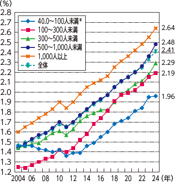 また、民間企業が常時雇用する労働者に占める対象障害者である労働者の割合(以下本章では「実雇用率」という。)は、2.41%(前年2.33%)と13年連続で過去最高を更新している。企業規模別に実雇用率をみると、規模が大きくなるほど高くなる傾向にあるが、小規模の事業所で低く、引き続き雇入れに向けた支援が必要である。