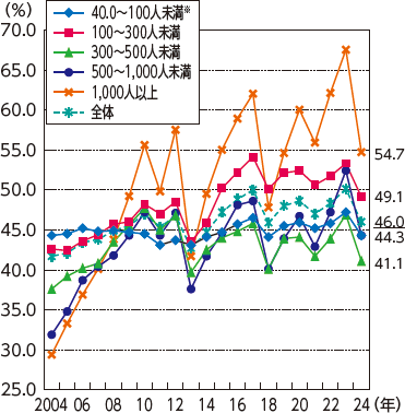2018年から2020年までは45.5人以上規模、2021年から2023年までは43.5人以上規模、
