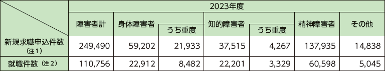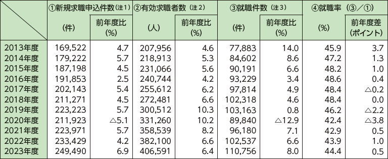 また、新規求職申込件数は約24.9万件(前年度比約7%増)となり、過去10年間で最多となっている。このうち、身体障害者は約6万件(前年度比約2%増)、知的障害者は約3.8万件(前年度比約5%増)、精神障害者は約13.8万件(前年度比約12%増)、その他の障害のある人は約1.5万件(前年度比約8%減)であり、就職件数と同様に、精神障害者の件数が比較的大きく伸びている。