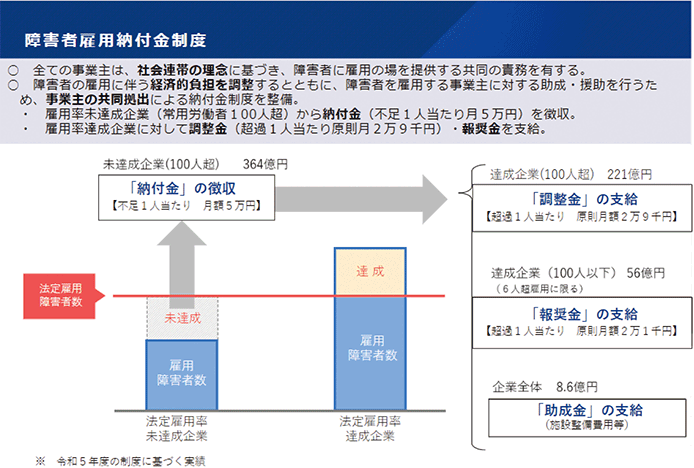 「障害者雇用促進法」は、障害者雇用率制度に加え、障害のある人の雇用に伴う事業主の経済的負担を調整するとともに、障害のある人の雇用を容易にし、社会全体として障害のある人の雇用水準を引き上げるため、障害者雇用納付金制度を設けている。この制度では、障害者雇用率未達成の民間企業(常用雇用労働者数100人超)から納付金を徴収するとともに、一定水準を超えて障害のある人を雇用している民間企業に対して、障害者雇用調整金、報奨金を支給している。