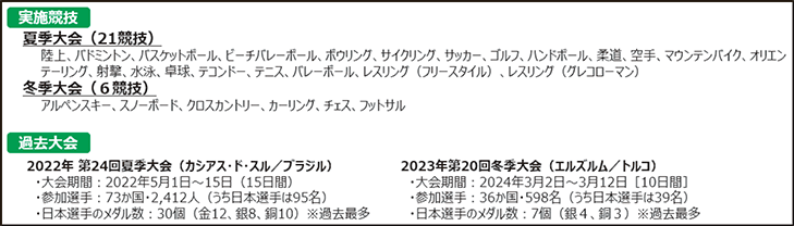 夏季大会は1924年にフランスのパリで第1回大会が開催され、2022年にはブラジルのカシアス・ド・スルにおいて第24回大会が開催された。冬季大会は1949年にオーストリアのゼーフェクトで第1回大会が開催され、2024年にトルコのエルズルムにおいて第20回大会が開催された。