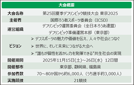 2025年11月15日(土)から26日(水)まで東京都、静岡県、福島県において「第25回夏季デフリンピック競技大会東京2025」が開催される。デフリンピック100周年の記念すべき大会であり、日本では初めての開催となる。